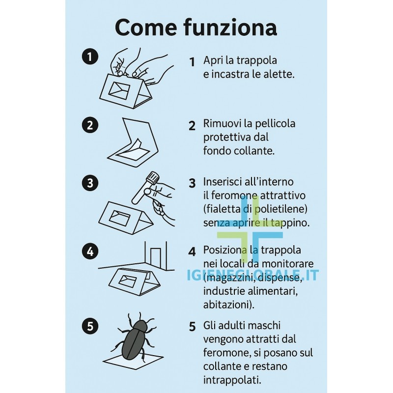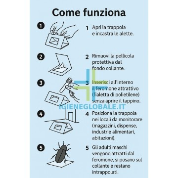 MODALITA' D'USO: Aprire la trappola incastrando le alette nelle apposite fessure, liberare il fondo collante dalla pellicola protettiva e attivare con feromone specifico. Posizionare la trappola nel luogo del monitoraggio e/o cattura.